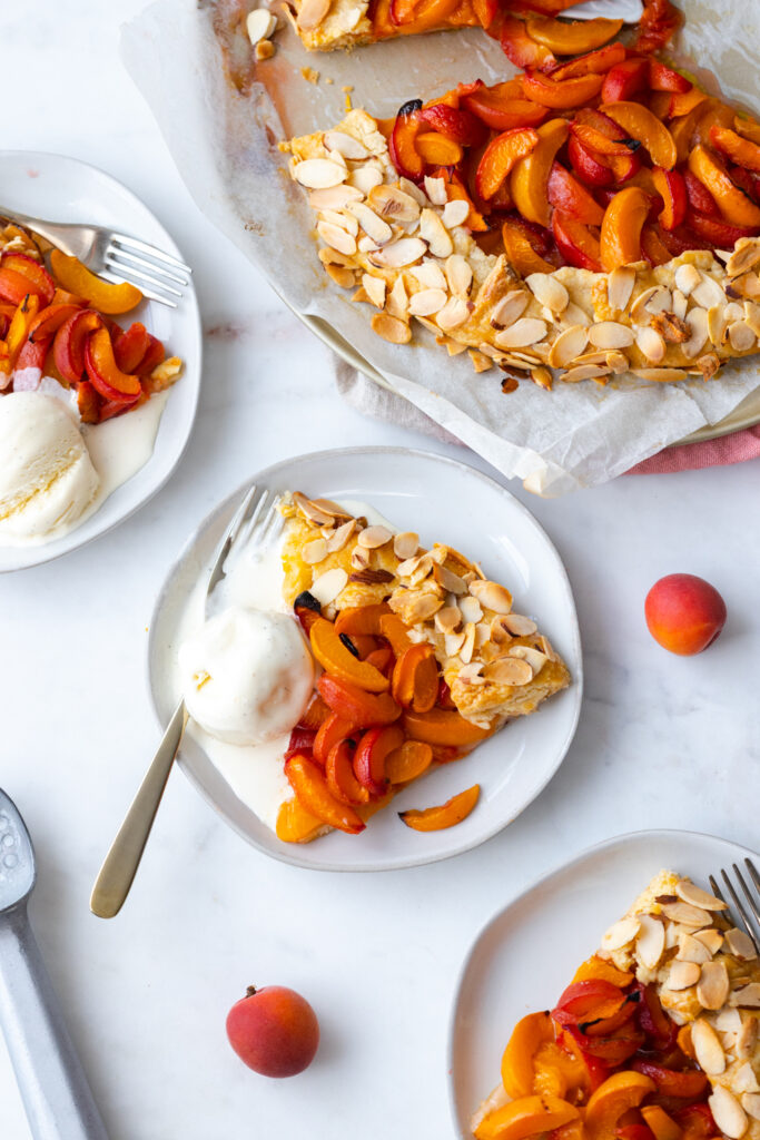 This summery Apricot Almond Galette with Cream Cheese Crust highlights sunny, seasonally sweet & tart apricots atop tender & flaky dough with crunchy sliced almonds.