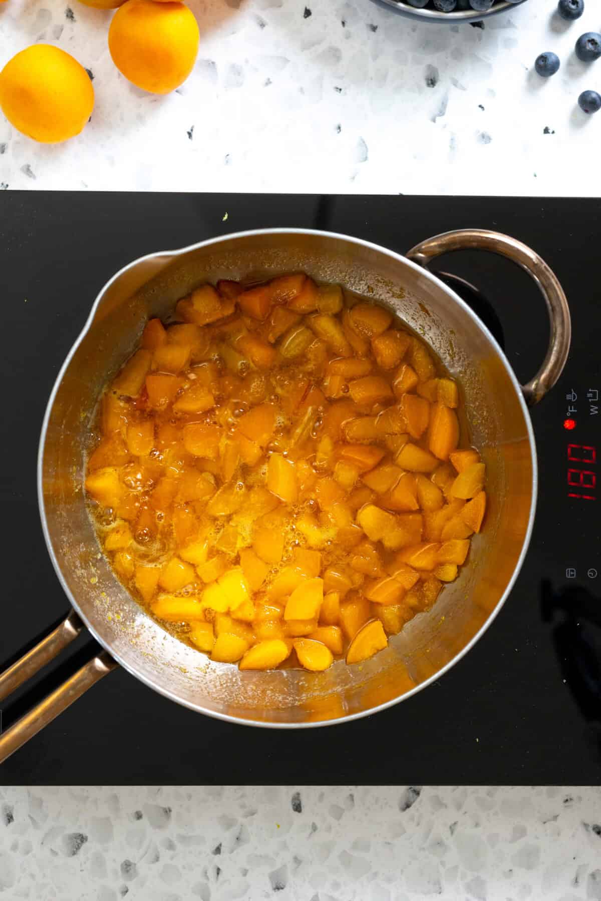 - Cook down the apricots on the stovetop with a little sugar and lemon juice + zest. This only takes a few minutes and breaks the apricots down into a jammy, syrupy mixture.
