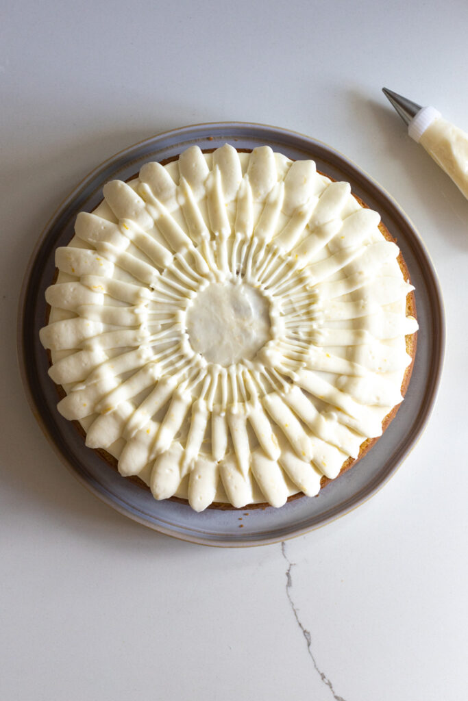 Stop and add the sifted powdered sugar. Mix together on a low speed until the powdered sugar is absorbed. Then turn up to medium high speed and mix until smooth and airy. - For Basic Frosting, use an offset spatula to simply spread the Lemon Cream Cheese Frosting over the top of the cooled cake, adding swoops and swirls.