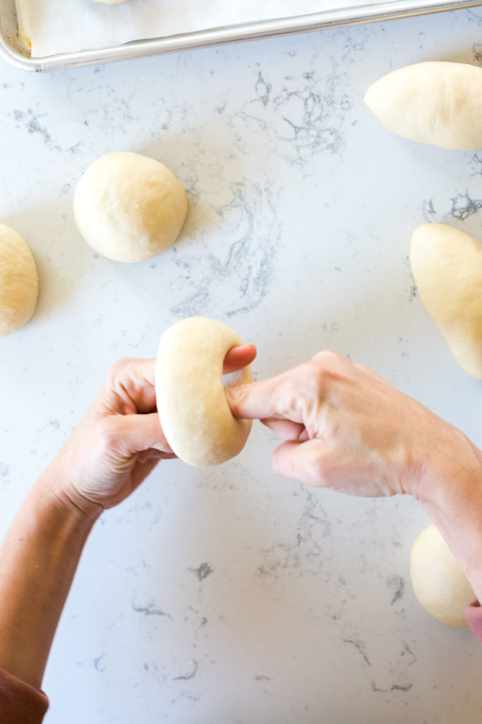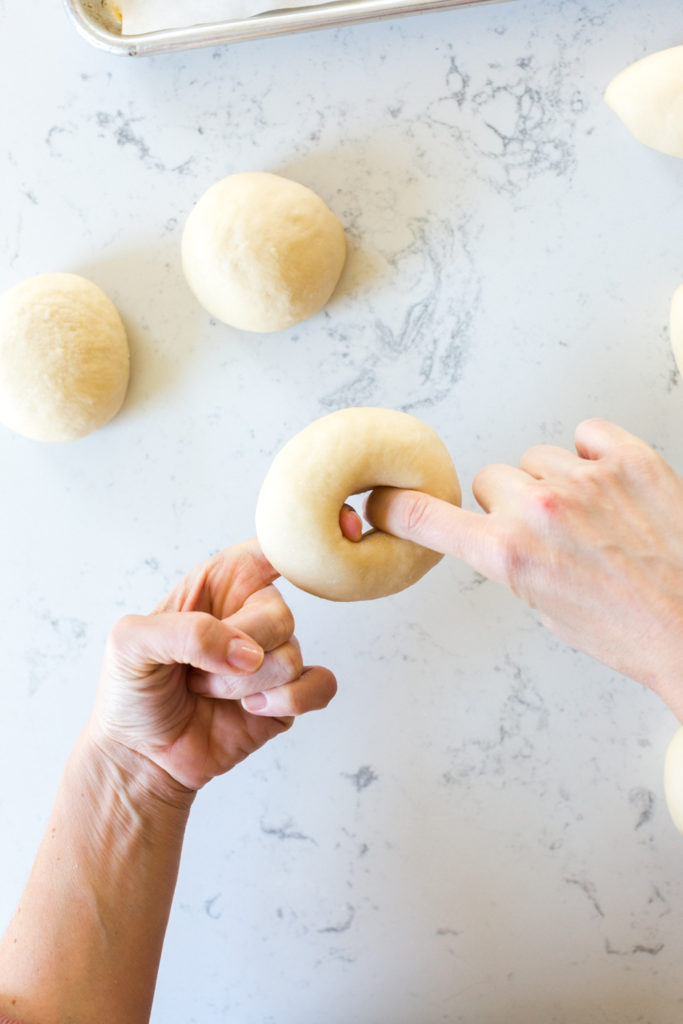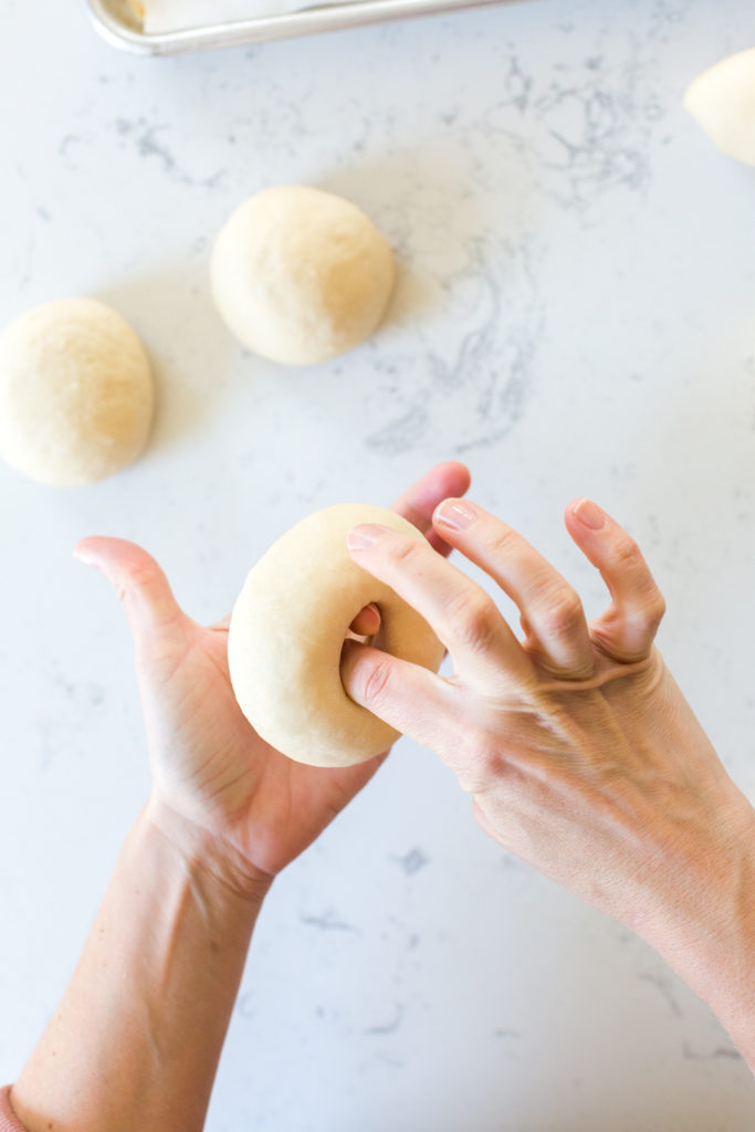 To pre-shape the dough, gently pat to deflate. Form each piece of dough into a loose ball by pulling the sides up and gathering it together in the center. Then pinch it together, almost like a dumpling. Turn it over so it's seam side down and create a C shape with your dominate hand around the dough ball. Start rolling your hand in small circles against the counter, with the dough ball rolling around inside your c shaped hand. After a few seconds it should start to build tension and roll into a tight, perfectly round dough ball. Set aside on a clean surface, seam side down, and cover with a clean, damp kitchen towel while you shape the rest. Allow the pre-shaped dough to rest for about 15 minutes. - BAGEL SHAPING METHOD 1 - POKE & SPIN: