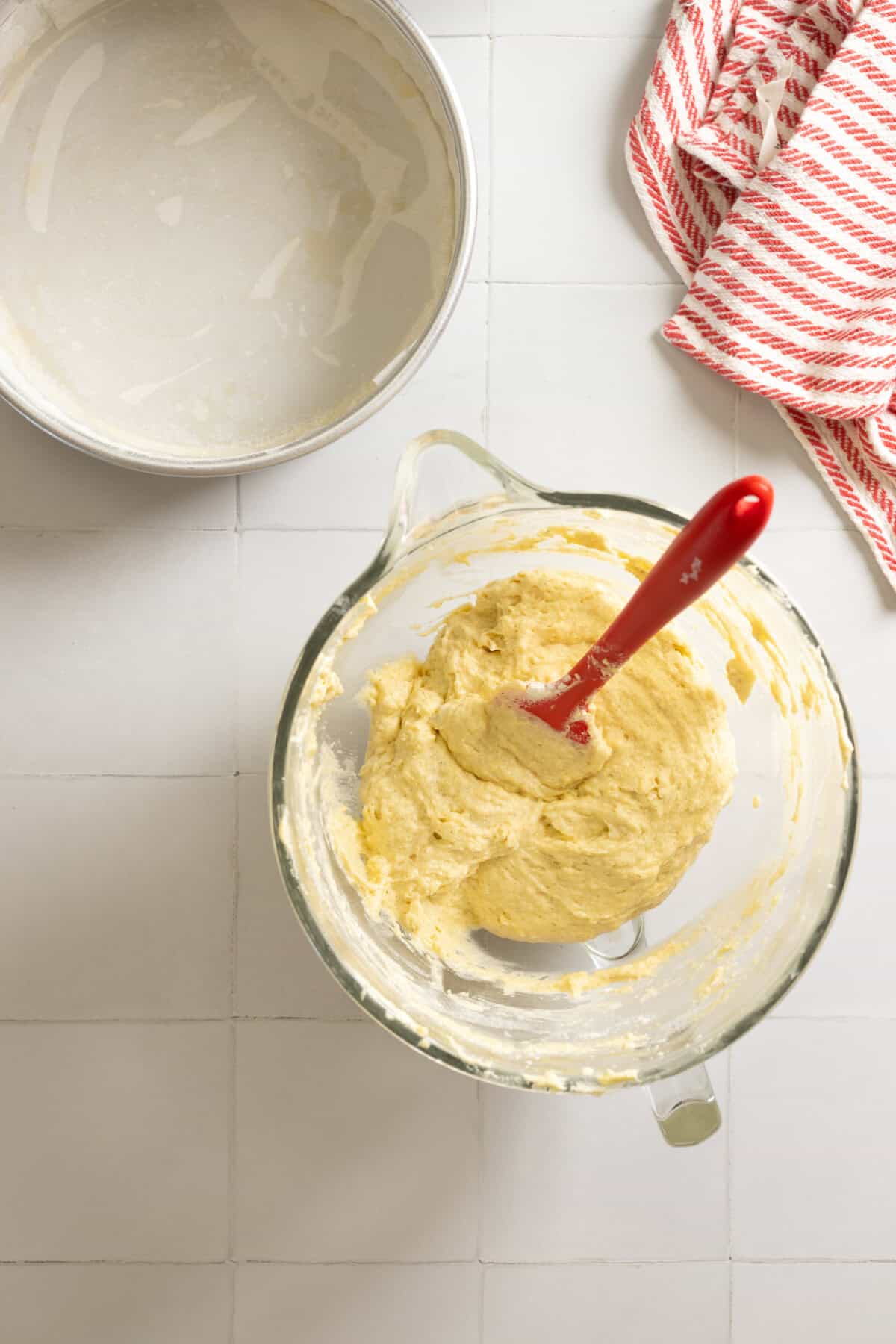 With the mixer on a low speed, stir in the the dry ingredients followed by the buttermilk in 3 additions. Begin with ⅓ of the dry ingredients, stir until just combined, followed by the half of the buttermilk. Alternating two times, starting and ending with the dry ingredients. Mix until just combined and smooth. Don’t over-mix the batter. Scrape down the sides and bottom of the bowl with a spatula to make sure it’s well combined.