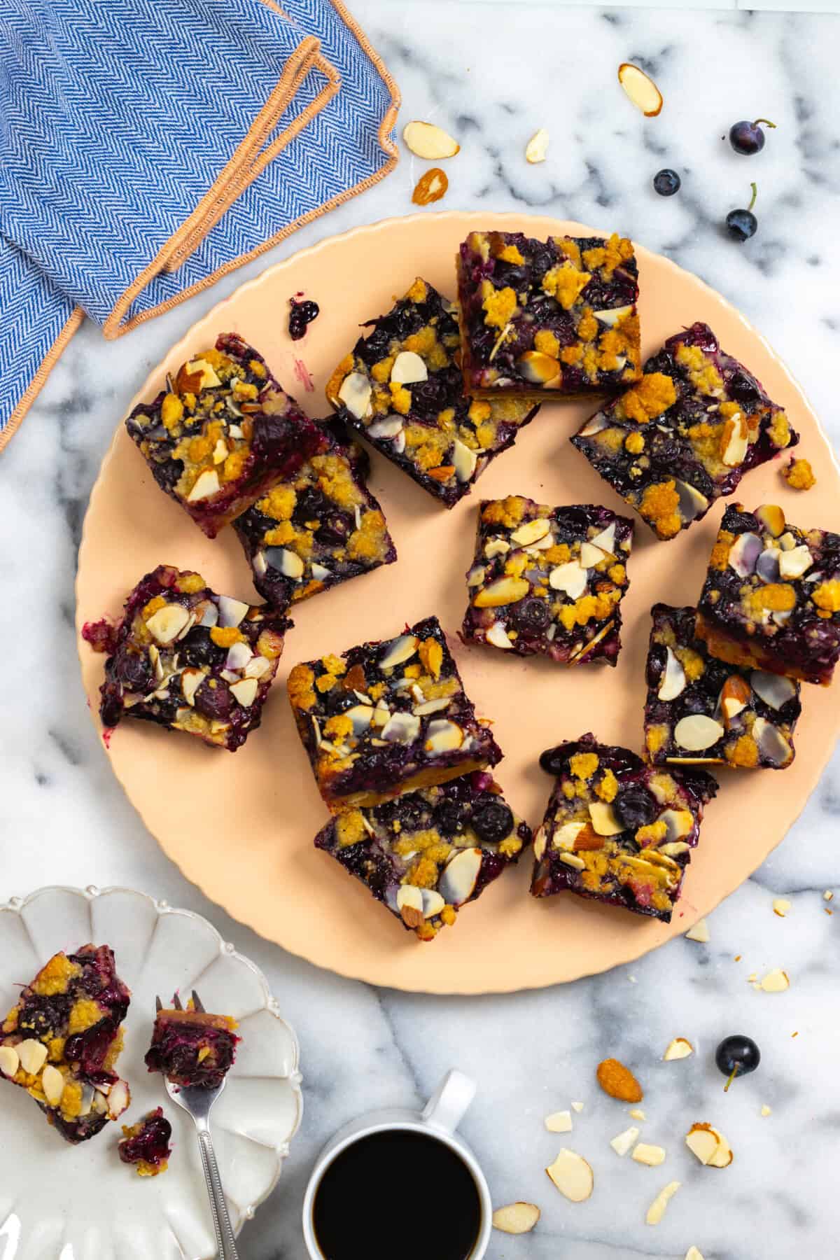 When it comes to serving these Blueberry Almond Shortbread Crumble Bars, go in knowing that things may get a little messy. That super jammy blueberry filling boasts sticky sweetness with vibrant color and flavor. So if you're eating them with your hands, your fingers are bound to get a little berry stained in the same way they do when picking fresh berries. 100% worth the risk, if you ask me. If that's a concern for you, serve these blissful berry bars on a fancy dessert plate with a fork for a more civilized presentation. Either way, these Blueberry Crumble Bars will taste decadent yet delightfully fresh.