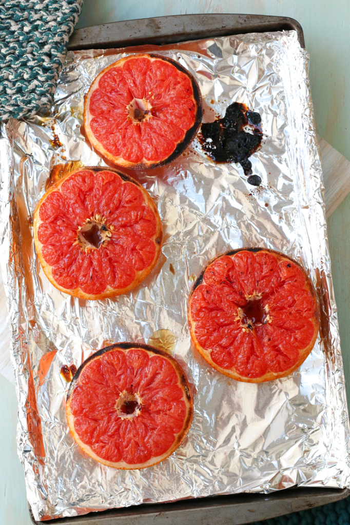 If you’re lazy (like me) and want to reduce cleanup, place the grapefruits on a foil lined baking sheet. Broil until the sugar starts to bubble up and caramelize and the top starts to blacken just a bit. Don’t worry if the edges burn, you don’t eat that part anyhow.