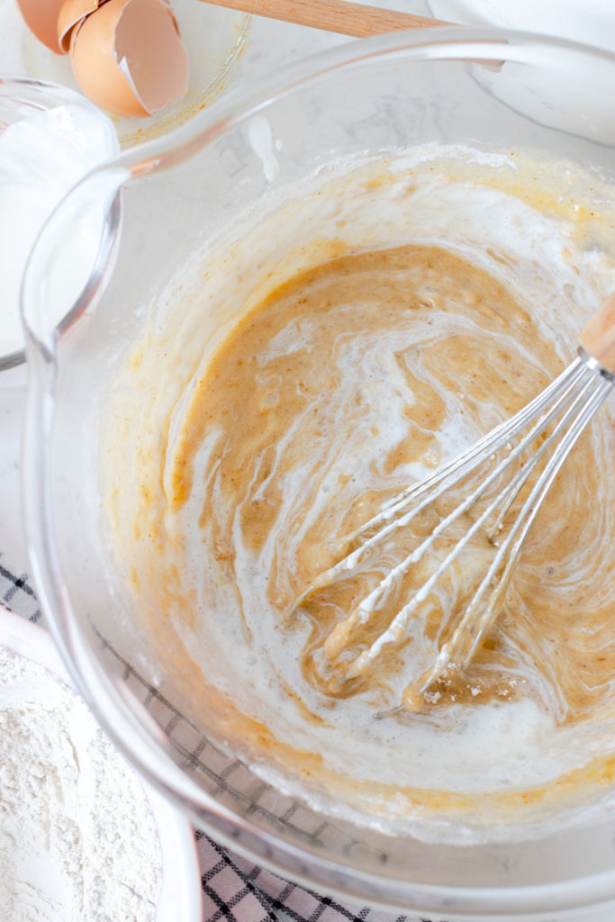 - Peel the bananas into a large bowl and mush them with the back of a wooden spoon until they resemble a puree. Then whisk in the brown sugar, granulated sugar and cooled browned butter until smooth. Followed by the eggs and vanilla.