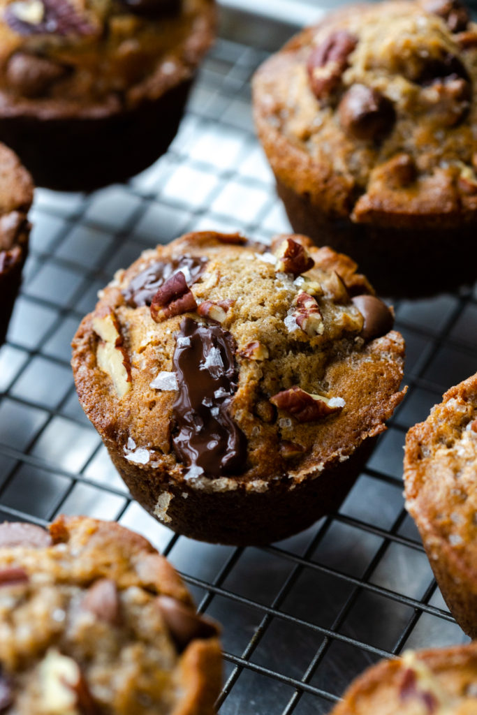 Warm, nutty brown butter notes intermingle with banana and vanilla in the base of this moist and tender loaf. It's studded with crunchy pecans, dark and milk chocolate chips and a slight sprinkle of briny sea salt flakes and hits on all of the comforting flavor notes. One slice is never enough.