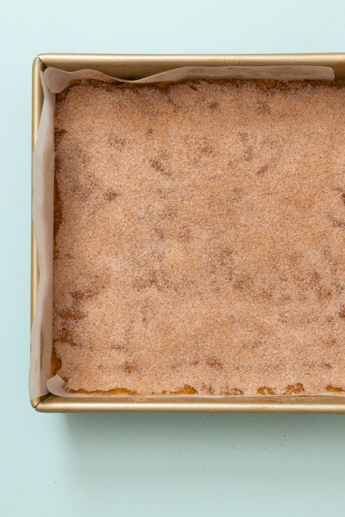 Spread the blondie batter into the prepared pan, using a spatula or your hands to press it evenly into the pan. Sprinkle the cinnamon sugar topping over the top of the Blondies.