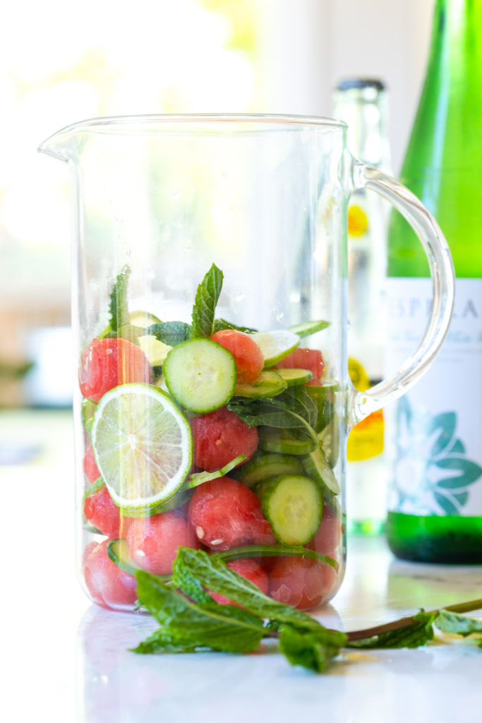 I like using a melon baller to make mini watermelon globes. And when I am feeling extra fancy, I will break out the mandolin to make thin cucumber ribbons.