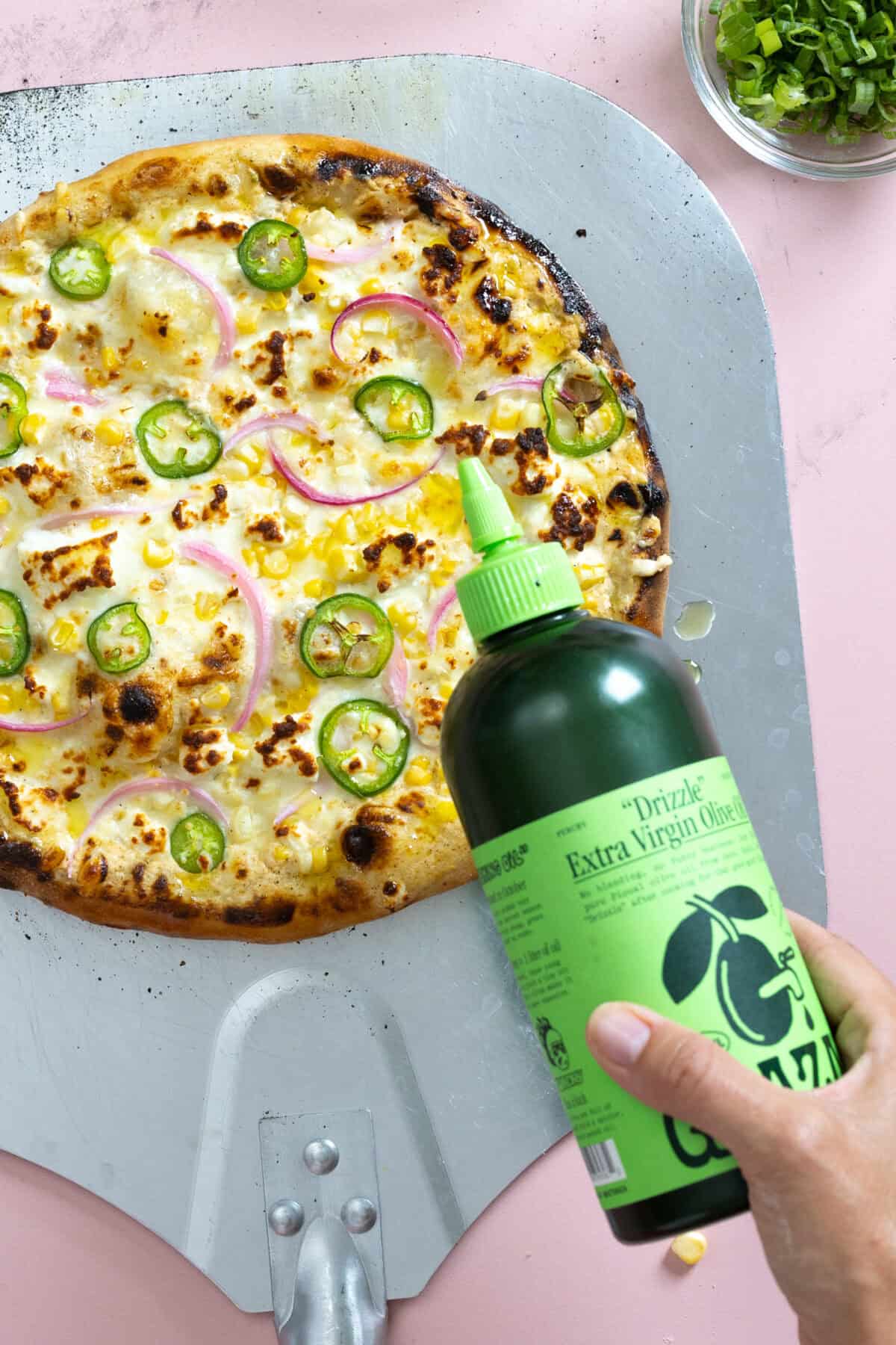 Right after the Elote Pizza comes out of the hot oven, drizzle some good quality olive oil over the entire pizza with a little extra focus on the crust edges. This gives the pizza added richness and a sexy glistening sheen. Then sprinkle on the freshly chopped cilantro and green onions for an herby, fresh finish!