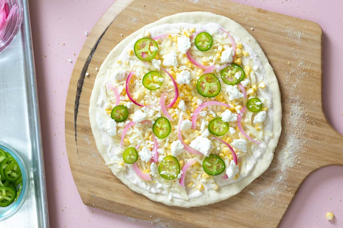 Top the pizza, first spoon some Garlic Crema Sauce onto the center of the stretched dough round. Use the spoon to spread the sauce evenly on the surface of the dough, leaving a rim around the edge. Next, sprinkle on the mozzarella, corn, pickled red onions and jalapeños. Crumble on the Cotija cheese. Don't over top your pizza, it will weigh down your pizza and make it difficult to slide into the oven.