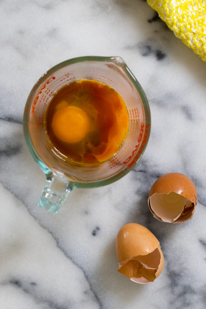 - Crack a whole egg plus another egg yolk and vanilla into a liquid measuring cup. With the mixer on low, slowly add to the sugar and butter mixture, one egg at a time. Allow each egg yolk to blend in completely before adding the next. Mix until smooth. Stir in 2 tablespoons of lemon juice.