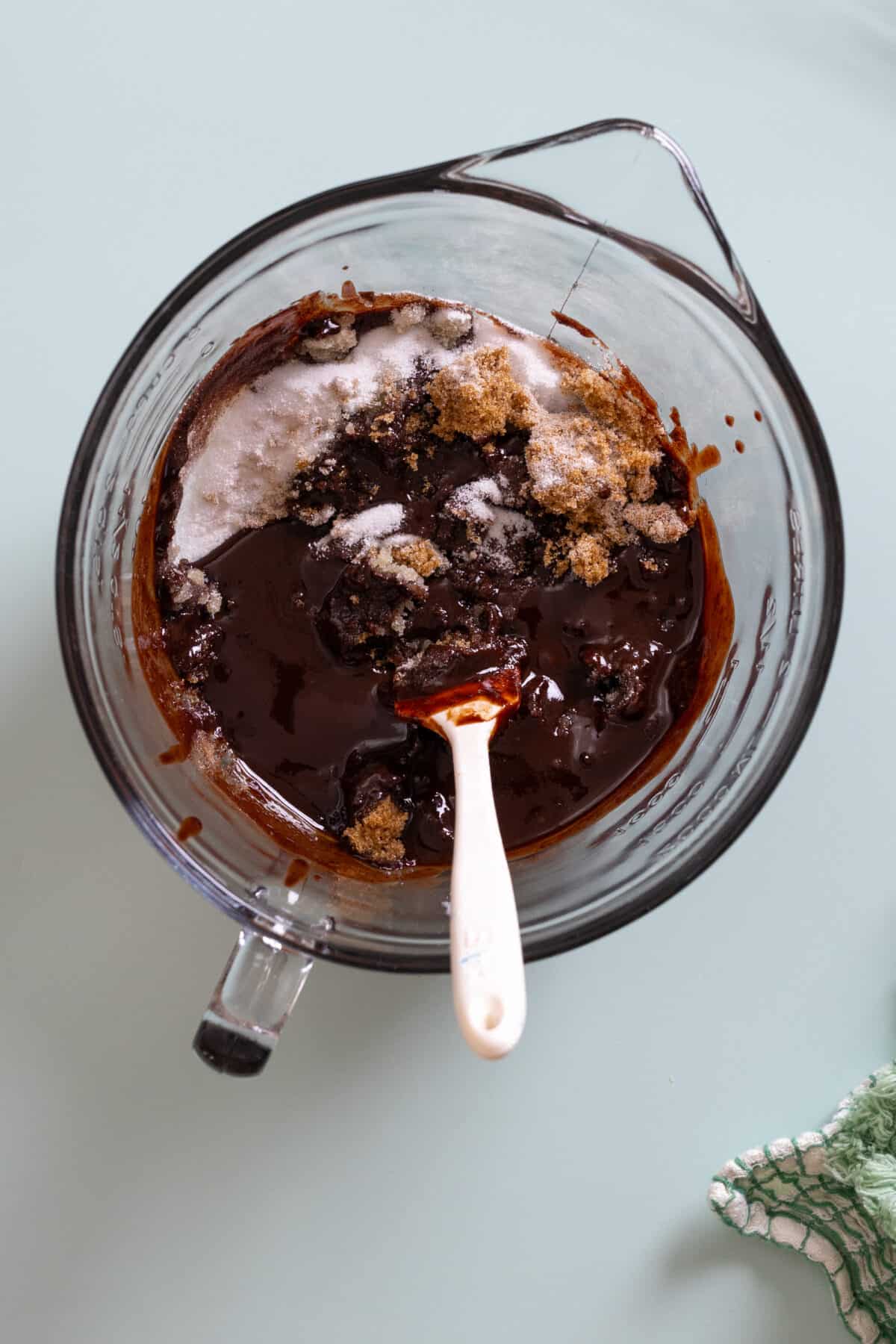 In a large mixing bowl, add sugars and melted chocolate mix. Whisk until smooth.