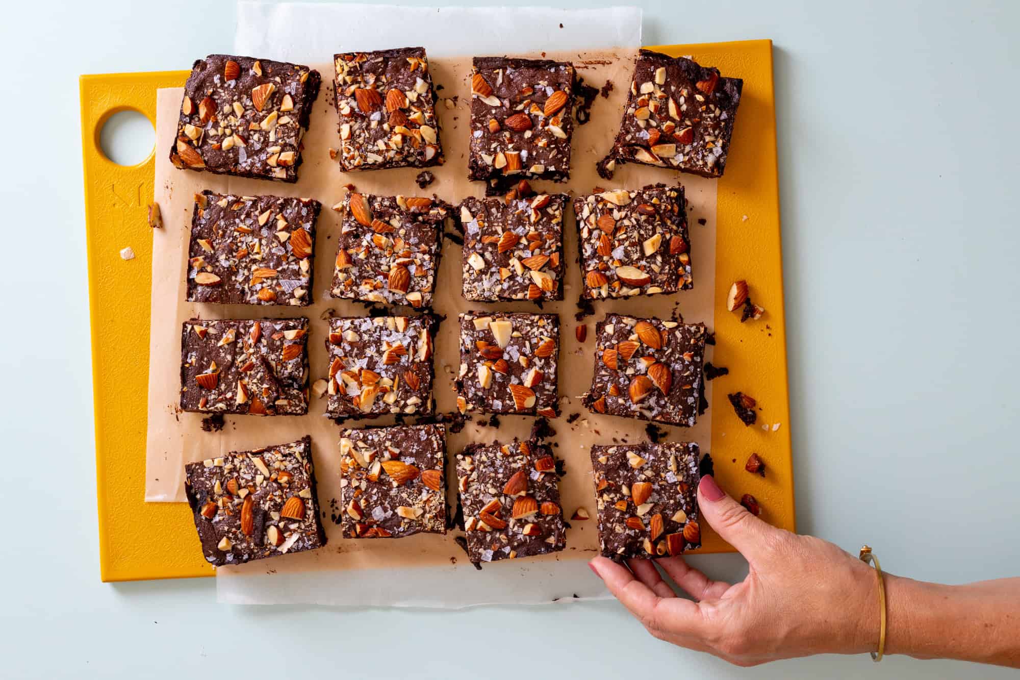 Bake brownies until a toothpick comes out with just a few crumbs sticking to it, about 28-33 minutes, depending on pan size used. Optionally top with sea salt flakes. Allow to cool completely in the pan. Then use the parchment paper to lift from the pan and slice into 16 squares.