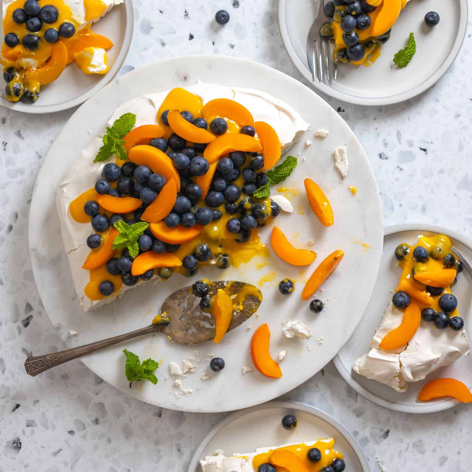 The assembly of this Pavlova with Apricot Curd and Blueberries is easy breezy but presents as oh so elegant. If you planned ahead well, your Pavlova will have a shallow indention in the center to hold the creamy Apricot Curd. Simply spoon the curd onto the Pavlova, smooth it out and give it some swirly swoops. Then pile on the blueberries and apricots. It could not be easier.