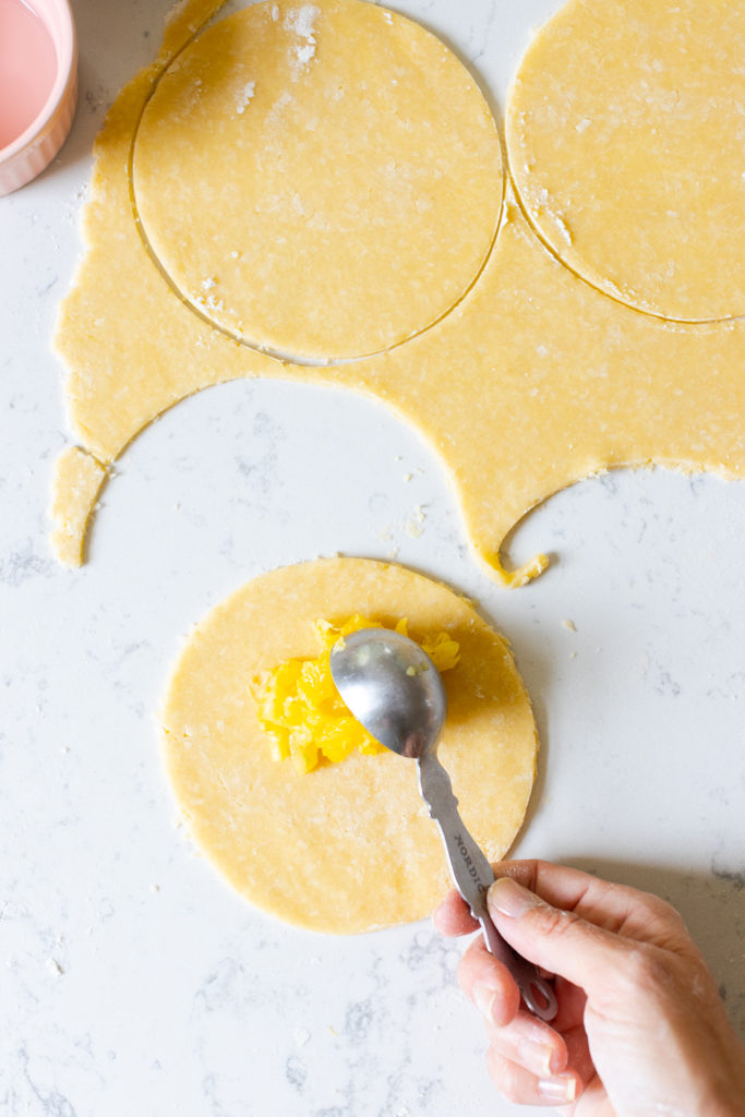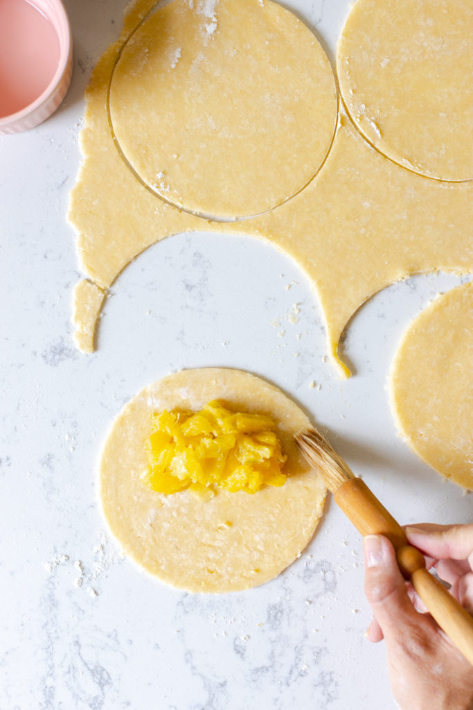 *You may want to transfer the dough rounds to a lined baking sheet and chill them in the refrigerator while you roll out and cut the rest of the dough so they don't get too warm. It depends on how quickly you can move and how warm it is in your kitchen. - Spoon about 2 tablespoons of pineapple filling onto one half of each round of dough. If the fruit filling is super juicy, strain again. You just want to be sure you aren't transferring a bunch of juice onto the dough to prevent leaks and soggy bottoms.