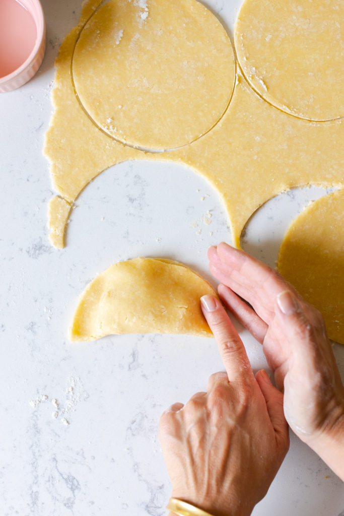 Lightly brush a small amount of cold water around the edges of the dough rounds, then lift and fold the unfilled half over the top, creating a half-moon shape.