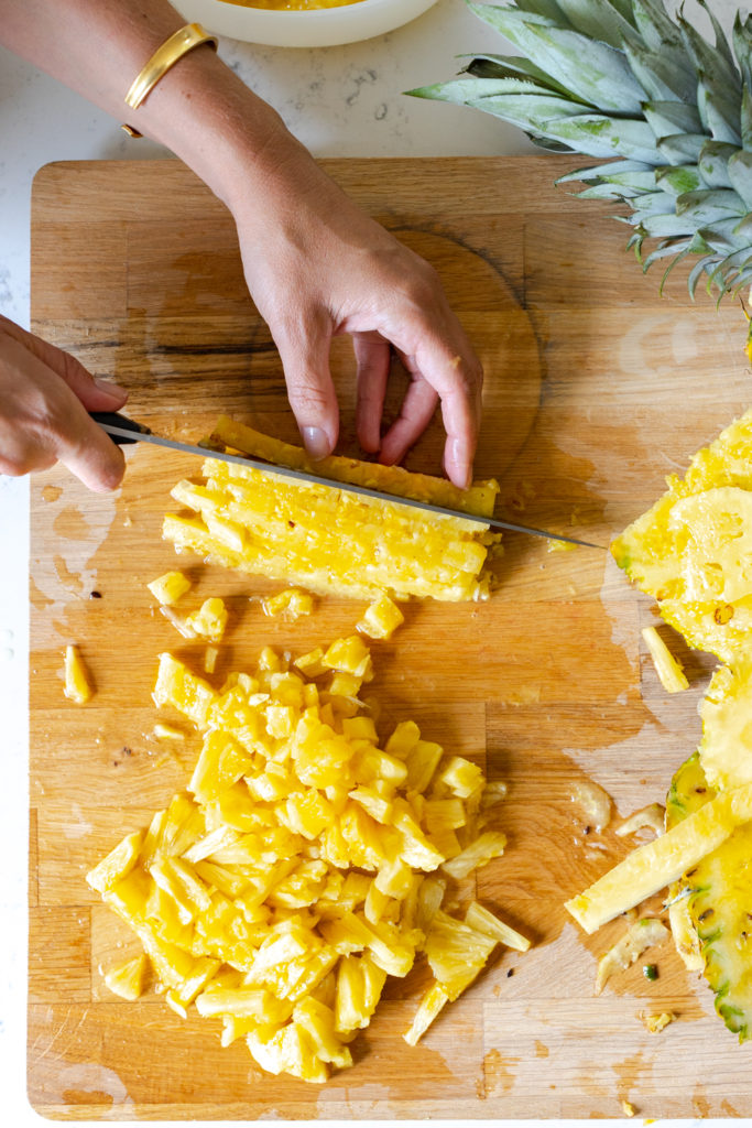 - Break down the pineapple by cutting off the top, then removing the skin all the way around. Slice the pineapple in half lengthwise. Lay each pineapple half down on the flat cut side, and cut it in half lengthwise again, into quarters. Then remove the core from each quarter. Chop into small ¼" - ½" chunks. Place in a bowl.